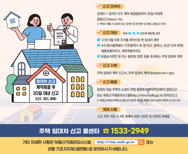 - 정의 : 주택 임대차 계약 신고제로 임대인, 임차인이 계약 체결일부터 30일 이내에 신고 해야 하는 제도