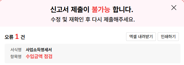 최종 제출 할때 오류가 뜨는 경우도 생깁니다. 이때는 아래 처럼 불가능 하다는 문구가 뜨면서 절대 제출 하지 못 할 것 같은 느낌이 듭니다.
