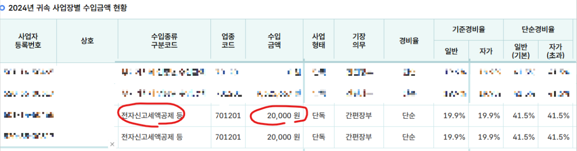 여기서 2만원의 전자신고세액공제가 보입니다. 이것은 작년에 전자로 신고 하면서 종이 아끼고 공무원 안 괴롭혔다고 나라에서 기특하다고 주는 혜택 입니다. 2만원을 공제 해준 것도 하나의 수익으로 들어가기 때문에 사업소득내에 기타소득으로 넣으면 됩니다.